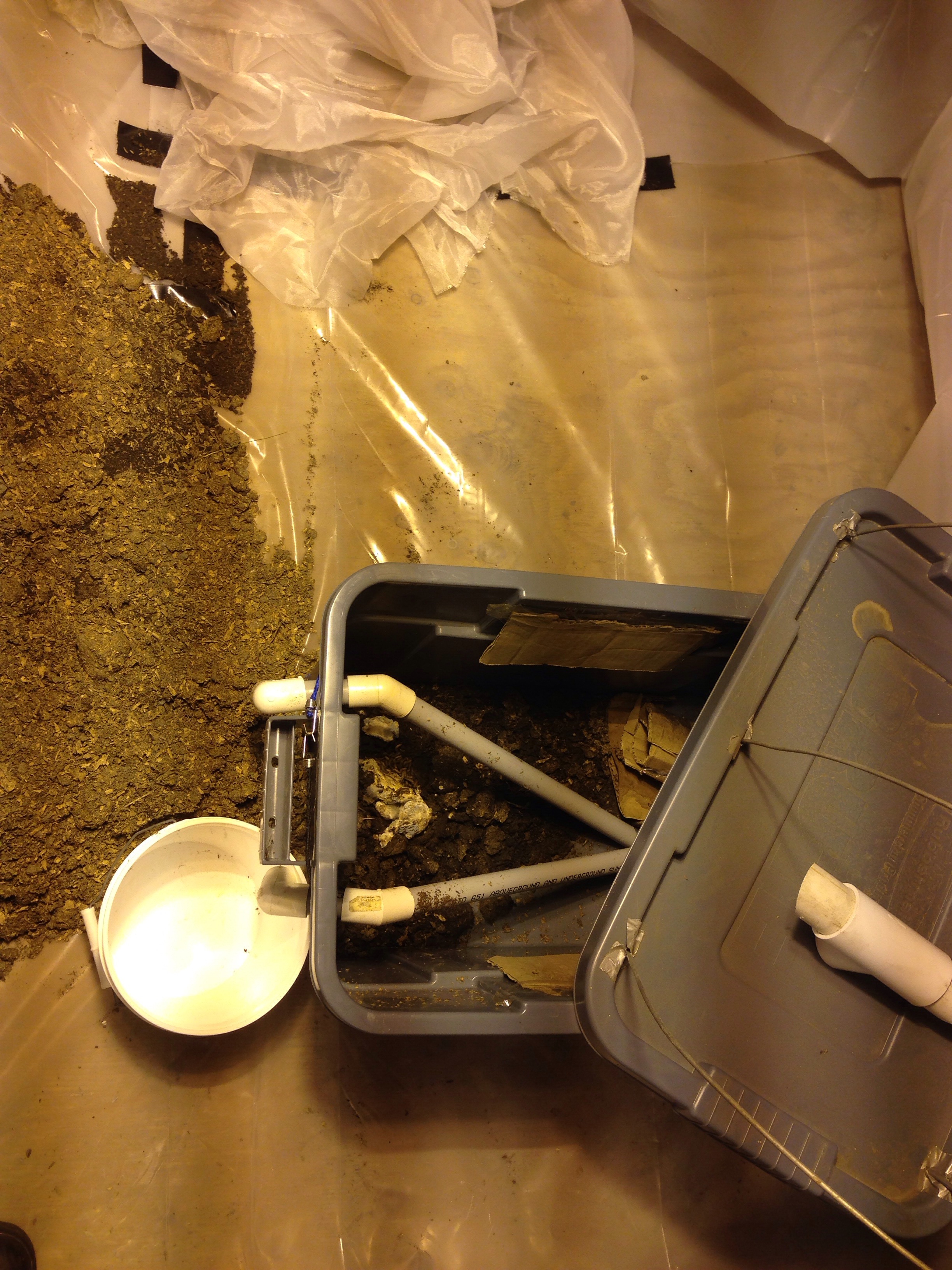 First week: Started with 20 gallon bin with two 3/4″ PVC tubes at a 45ish degree angle with cardboard as a place for laying eggs. Tube number one leads to a bucket for collecting larvae. Tube number two leads to compost. I placed some partially field composted cow manure and a very old piece of tomato in as a food source. There is a 400watt full spectrum hps lamp in the room to provide some UV light. I read somewhere UV light is required for mating. Also in the chamber is some compost and partially composted horse manure outside of the bin to encourage the larvae that crawl up tube number two to pupate and emerge as adults.