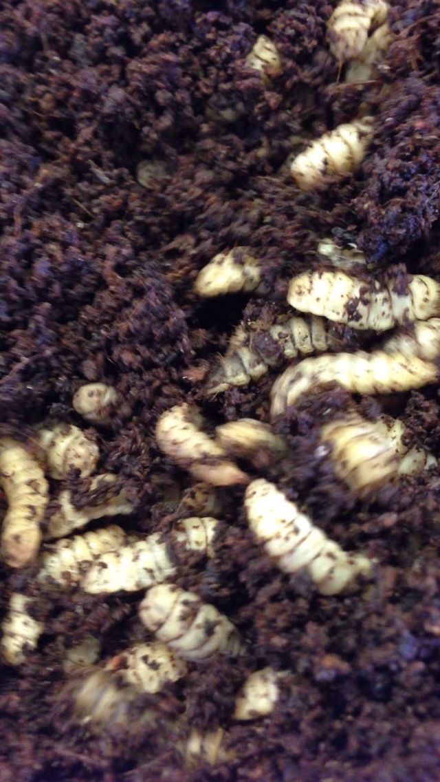 Most larvae are dark in color. Couple white ones wriggling. They’re either pupating or dead. Starting new bin design.