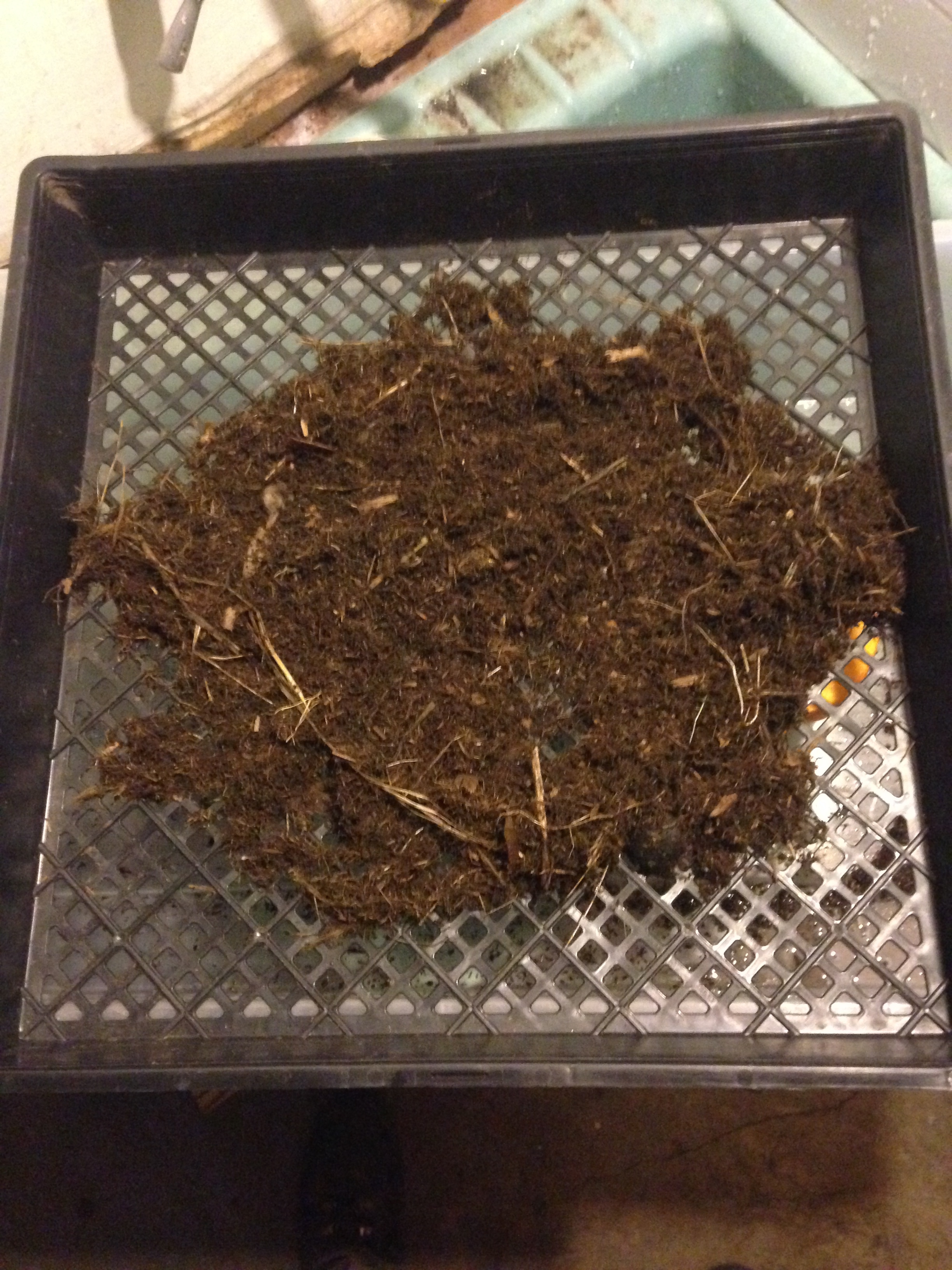 Moving the herd to slaughter has proven more difficult than I imagined. It’s easy to pluck out a bunch of worms from the system. It’s getting them clean from the “horse fiber”. As the worms consume the bacteria and fungi that are breaking down the horse buns, the lignin in the hay they eat breaks down slowly and you get this felt like look on the top of the worm bin. This is the sign that more feedstock (horse manure) needs to be added. I call that felty looking stuff horse fiber. At this time, it is easiest to collect a bunch of worms simply by grabbing them with your hands. I’m going to try this for separating them.