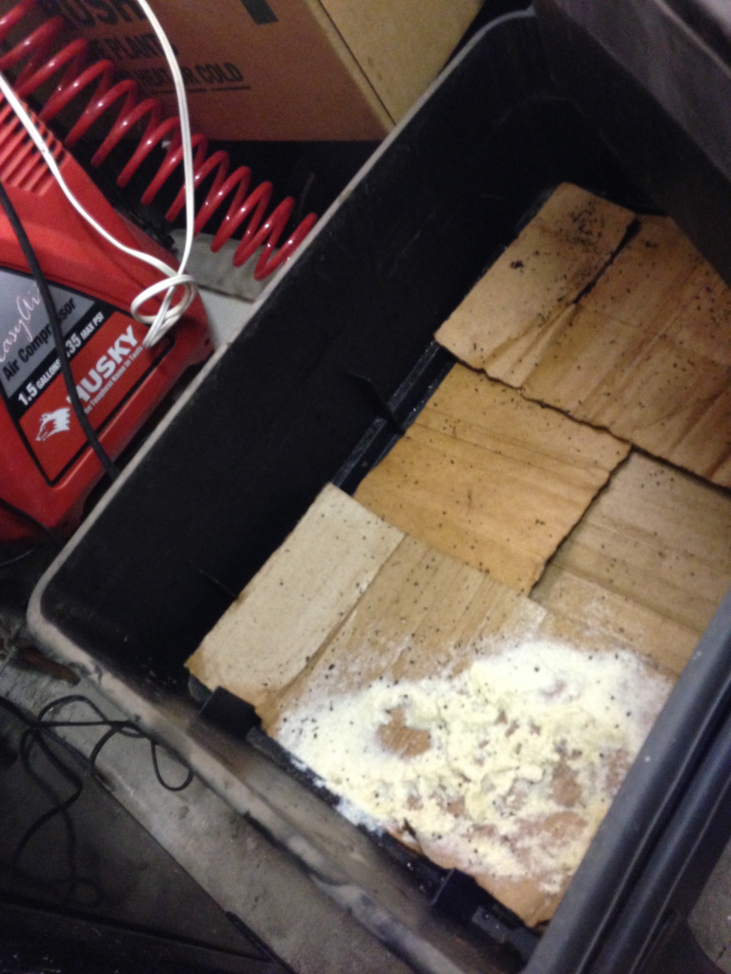 After a few days many of the worms migrated down to the fancy feast I prepared. I waited 10 days. The oatmeal was gone and they had started on the decaying cardboard. There were quite a few worms in there ready to try out the new process.