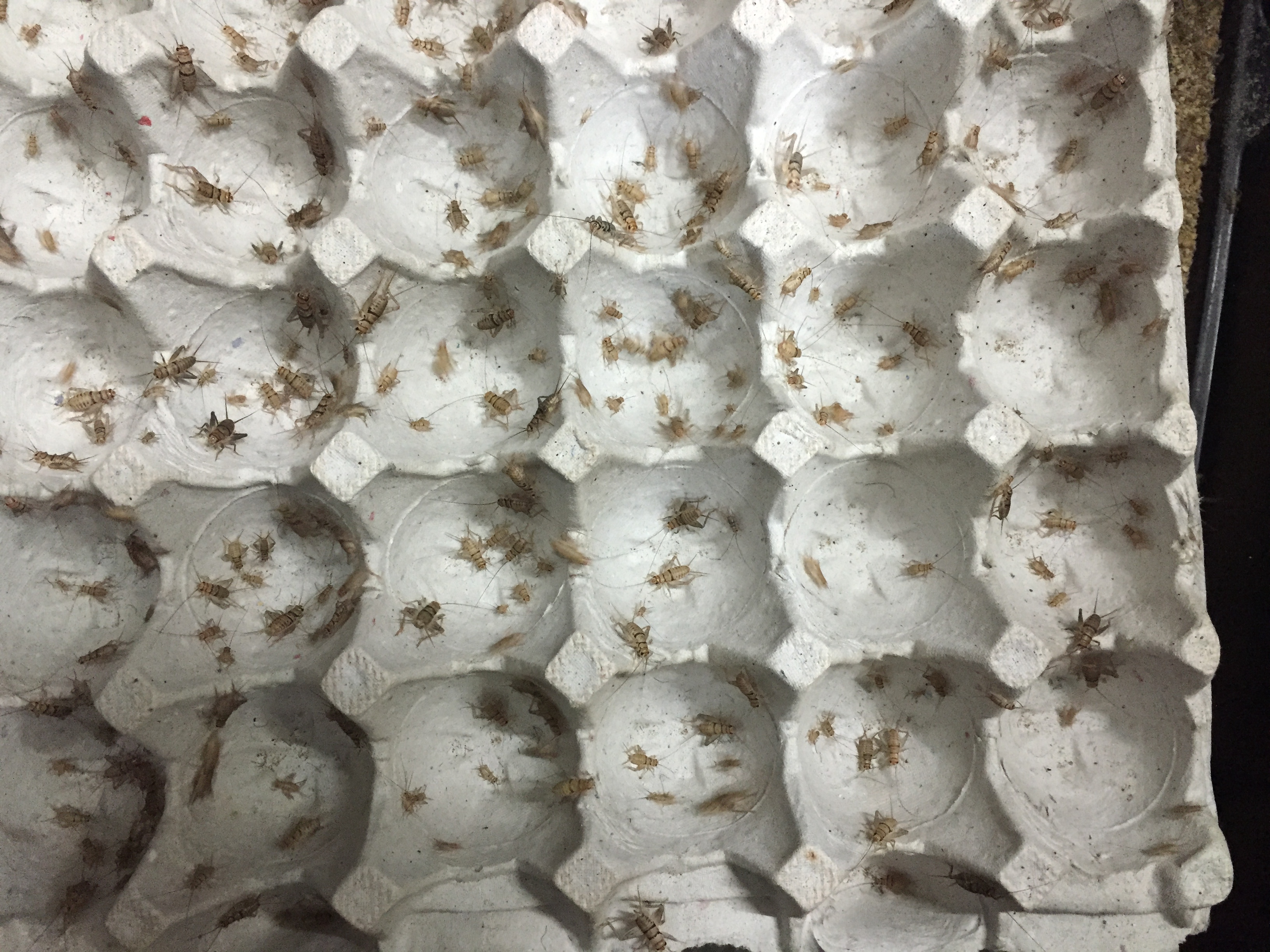 So far, the crickets have been pretty successful. I’ve been building the colony and harvesting here and there, but mostly, trying to get the numbers up to have consistent harvests. Before I knew the dehydration problem was happening, I was getting about 66 grams per bin. I believe that number is kind of low as my production methods were still kind of rough. Now that I have the premature dehydration figured out, the bins are chock full of crickets. At least, it sure looks like there are more crickets in the bins at this point. So lets say I get about 3 or 4 ounces per bin. Gosh I hope my math is correct here… Most fish foods are around 32% protein. If you take 32% of 16 ounces, that is 5.12 ounces of protein needed to make one pound of fish food. My fish are eating about a pound a day.